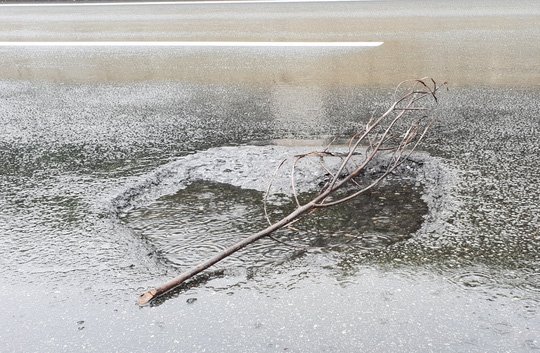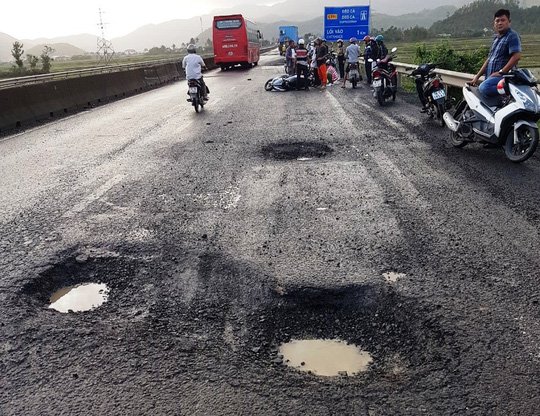 Rất nhiều ổ gà có đường kính 20-30cm xuất hiện trên đường cao tốc Đà Nẵng - Quảng Ngãi, đoạn qua huyện Bình Sơn, tỉnh Quảng Ngãi.