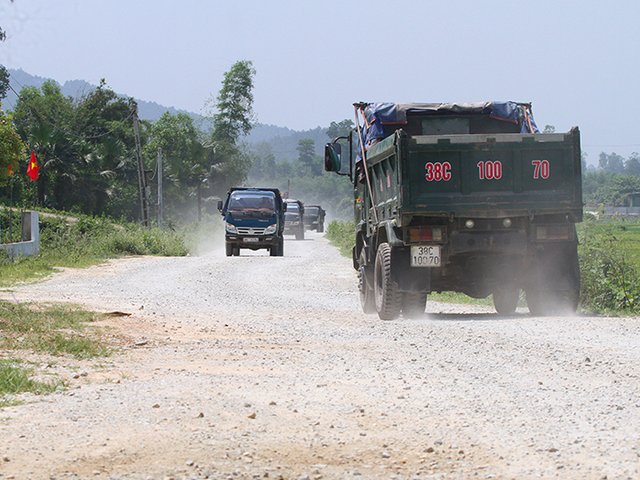 Mỗi ngày hàng chục xe tải chở vật liệu liên tục chạy qua thôn Trường Thủy (Hà Tĩnh) khiến bụi bay mù mịt.