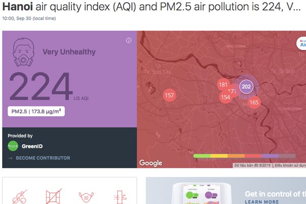 Sáng nay (30.9), nhiều khu vực ở Hà Nội có mức chỉ số chất lượng không khí AQI chuyển sang màu tím và nâu - mức nguy hại cho sức khoẻ con người.