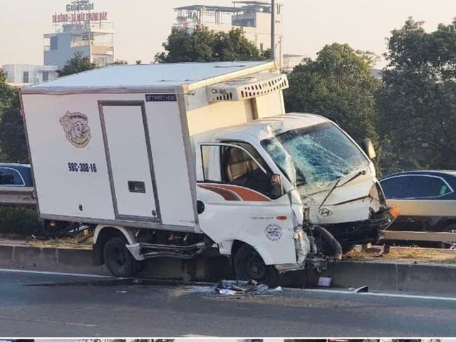 Sau cú tông mạnh vào giải phân cách, xe ô tô tải biến dạng rồi lật nghiêng, hư hỏng nặng ở phần đầu, cơ quan chức năng đưa phụ xe ra khỏi cabin nhưng đã tử vong.