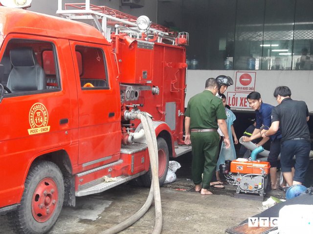 Sáng 10/12, hàng chục cán bộ chiến sĩ Cảnh sát PCCC Đà Nẵng túc trực hút nước để cứu hàng trăm ô tô, xe máy dưới tầng hầm chung cư Hoàng Anh Gia Lai Lake View (quận Thanh Khê, Đà Nẵng).