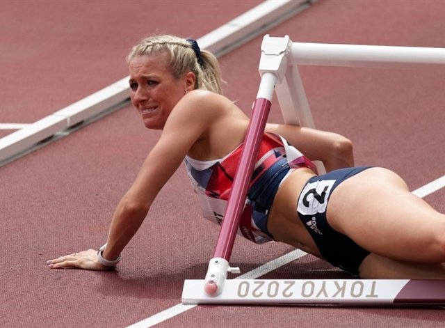 VĐV người Anh Jessie Knight bật khóc sau khi vấp ngã ở lượt chạy vòng loại 400m vượt rào.