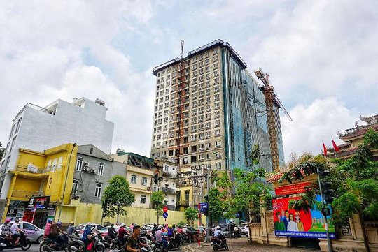 Ghi nhận tại tòa nhà 8B Lê Trực (Quận Ba Đình, TP Hà Nội) ngày 11-5, công trình không có công nhân ra vào làm việc, chỉ có 2 bảo vệ trực tại đây.