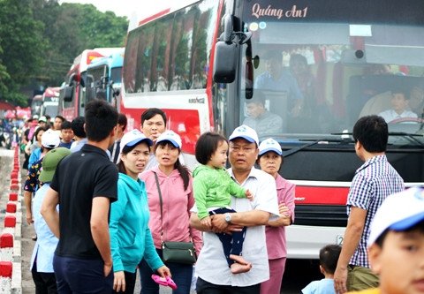 Hàng trăm du khách đợi chờ nhiều giờ không đến lượt xuống phà đã xuống xe, bồng bế nhau đi bộ trên đoạn đường dài 2km.