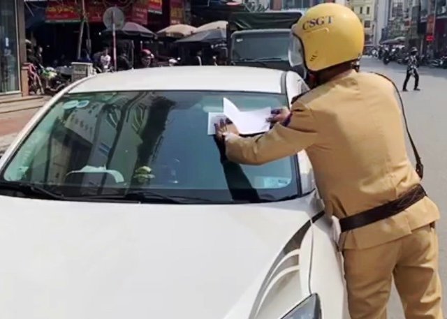 Cảnh sát giao thông dán giấy phạt trên kính xe