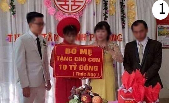 Bức ảnh cô dâu chú rể nhận tấm bảng đỏ ghi rõ “Bố mẹ tặng cho con 10 tỉ đồng” (ảnh 1) là nguyên nhân bắt đầu màn “bàn phím chiến” trên mạng xã hội ngày cuối tuần.