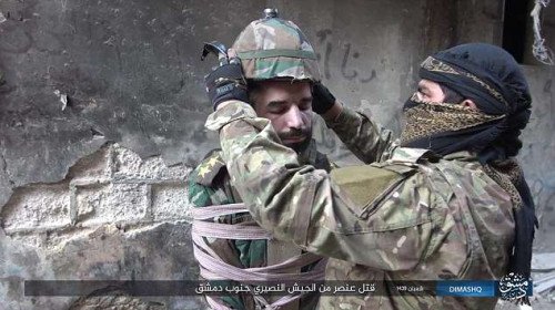 Phiến quân IS đã dùng dây trói chặt một tù nhân, lắp thuốc nổ vào mũ bảo hiểm rồiném anh ta ra khỏi một tòa nhà, kích nổ trong không trung.
