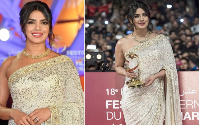 Lên nhận giải tại liên hoan phim quốc tế Marrakech tối 5/12, Priyanka Chopra tỏa sáng trong bộ váy Ấn Độ ánh kim lộng lẫy.