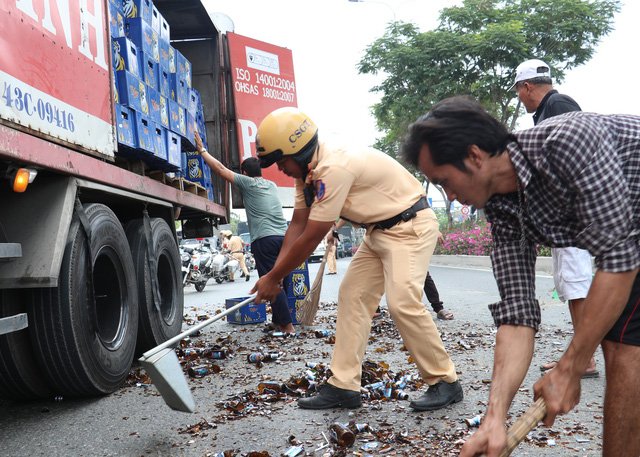 Chiếc xe tải bung thùng làm hàng chục thùng bia rơi xuống đường, CSGT cùng người người dân phụ tài xế dọn dẹp và điều tiết giao thông giữa dòng xe kẹt cứng.
