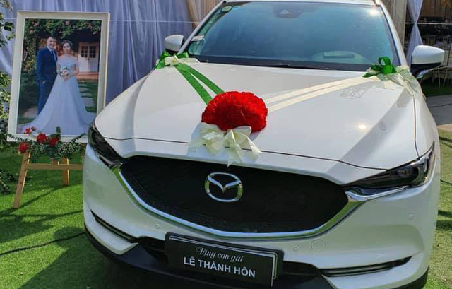 Đúng ngày cưới bố mang Mazda trắng để trước rạp cùng tấm biển "Tặng con gái, lễ thành hôn"