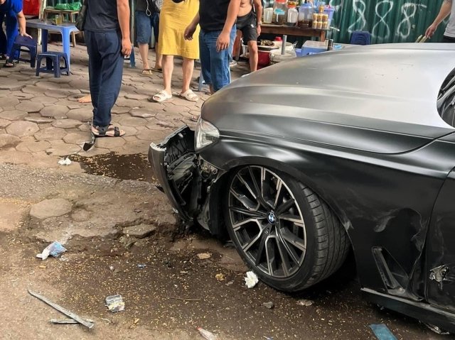 Chiếc ô tô Mercedes-Benz S450 khi lưu thông trong ngõ đã va chạm với xe BMW đỗ ven đường và nhiều xe máy trên vỉa hè.