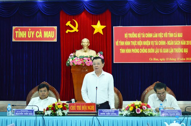 Sáng nay (13.12) ông Đinh Tiến Dũng - Bộ Trưởng Bộ Tài chính dẫn đầu đoàn công tác đã có buổi làm việc với tỉnh Cà Mau về tình hình thực hiện nhiệm vụ tài chính - ngân sách năm 2018, tình hình phòng chống buôn lậu và gian lận thương mại.