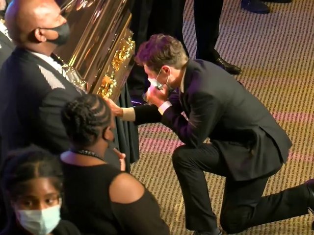 Thị trưởng Minneapolis Jacob Frey khóc nức nở khi quỳ bên cạnh quan tài của George Floyd trong tang lễ ở thành phố này.