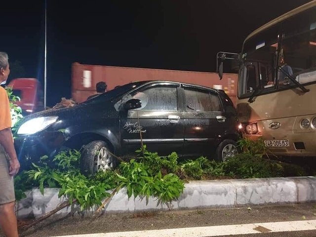Đang chạy tốc độ cao, ô tô chở hơn 30 khách Trung Quốc mất lái, húc văng ô tô 4 chỗ lên dải phân cách. Hành khách hốt hoảng thoát ra ngoài.