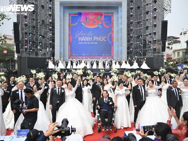 Sáng 6/12, tại phố đi bộ hồ Gươm, 80 cặp uyên ương cùng tiến vào lễ cưới tập thể tạo nên cảnh tượng giàu cảm xúc, thu hút đông đảo người dân.