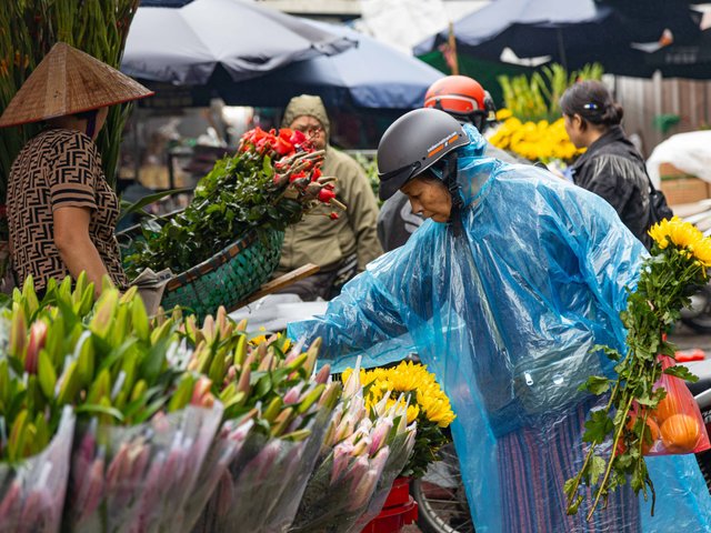 Người Hà Nội đội mưa, dậy sớm đi sắm đồ cúng rằm tháng Giêng