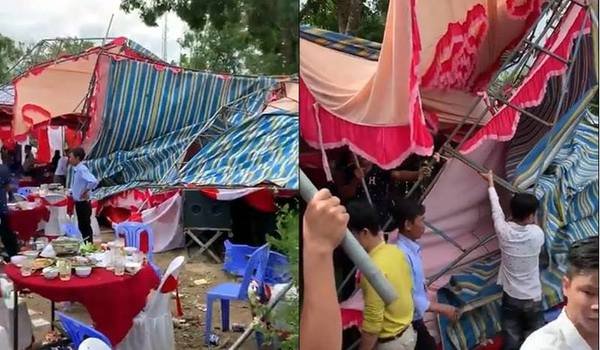 Chỉ trong khoảng chưa đầy 10 giây, một cơn lốc cực mạnh đã cuốn bay toàn bộ rạp cưới khiến hơn 300 người chạy tán loạn, 2 người bị thương ở đầu, có người phải khâu tới 7 mũi.