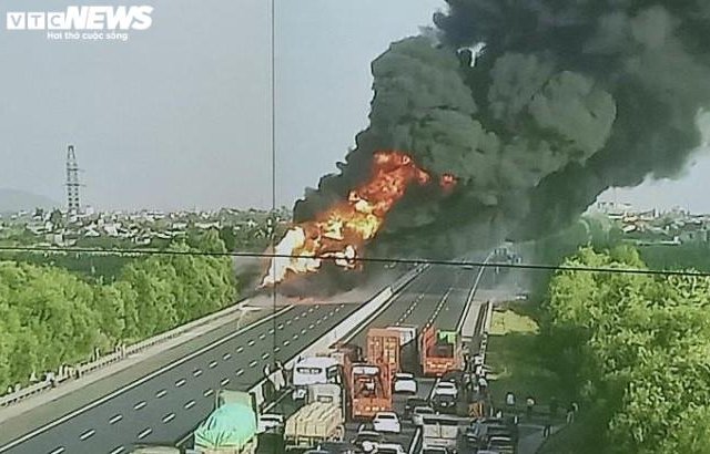 Xe bồn bốc cháy ngùn ngụt trên cao tốc Hà Nội - Hải Phòng