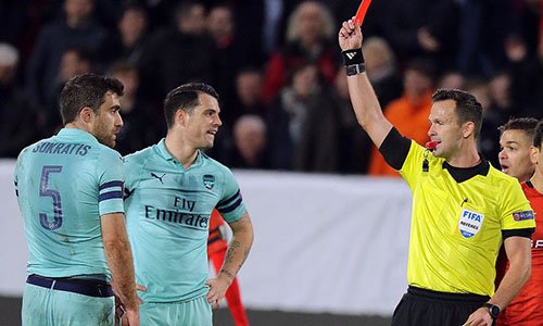 Sokratis bị đuổi cuối hiệp một, khiến CLB Anh thua Rennes 1-3 ở lượt đi vòng 1/8 Europa League, tối 7/3.