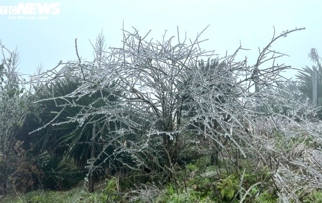 Với mức nhiệt -1 độ C, đỉnh Mẫu Sơn (Lạng Sơn) xuất hiện băng giá phủ lên cây cối, đường đi.