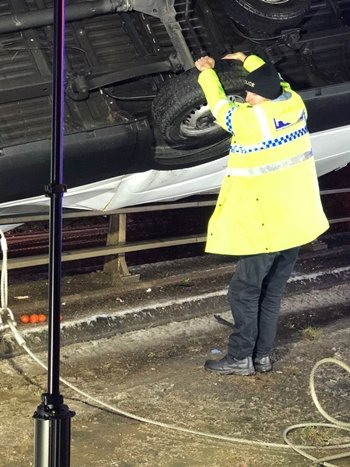 Một cảnh sát dùng sức giữ một chiếc xe van bị lật để ngăn nó rơi khỏi cầu sau tai nạn giao thông.