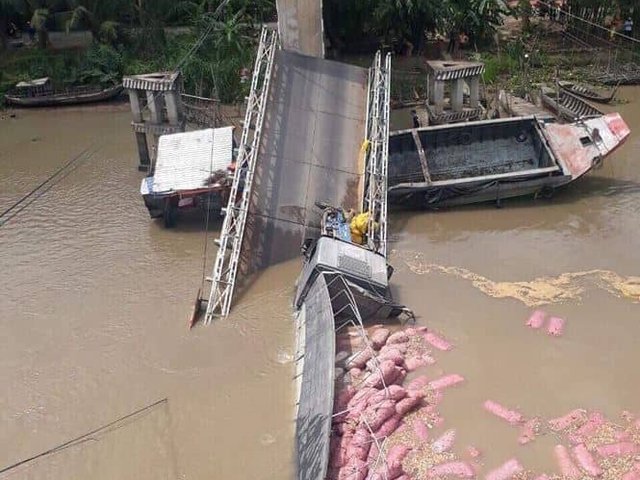Nhịp giữa của cầu Tân Nghĩa ở Đồng Tháp bất ngờ đổ sập khiến xe tải và xe ba gác chở hàng rơi xuống sông.