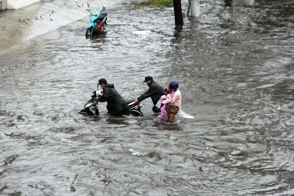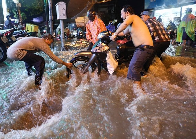 Sài Gòn mưa lớn, người dân qua "rốn ngập" lội nước mệt nghỉ