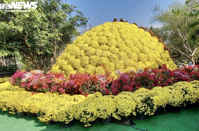 Bó cúc mâm xôi dài 12m, cao gần 7m được kết lại từ hơn 400 chậu hoa của người đàn ông ở TP Sa Đéc, Đồng Tháp khiến nhiều người phải ngỡ ngàng.