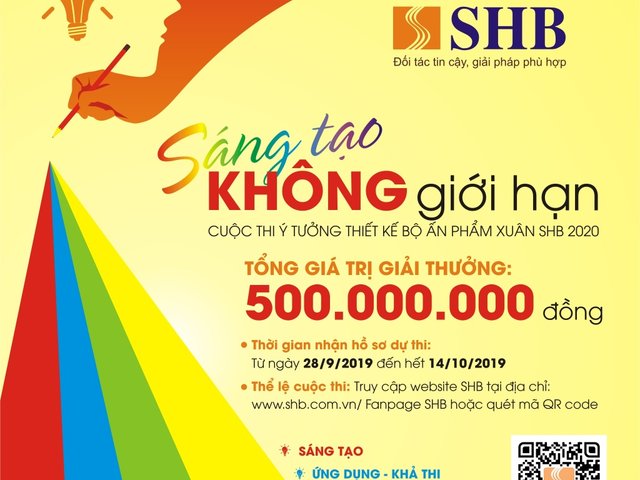 <p><strong>Ngân hàng TMCP Sài Gòn – Hà Nội (SHB) chính thức phát động cuộc thi ý tưởng thiết kế bộ ấn phẩm xuân 2020: “Sáng tạo không giới hạn”. Cuộc thi nhằm tìm kiếm những tác phẩm thiết kế ấn tượng, độc đáo, khác biệt…phù hợp với lĩnh vực tài chính ngân hàng đồng thời truyền tải được hình ảnh, thông điệp, giá trị thương hiệu của SHB. Cuộc thi dành cho tất cả các cá nhân, tổ chức là người Việt Nam và người nước ngoài (ngoại trừ thành viên Ban tổ chức, Ban giám khảo). Tổng giá trị giải thưởng hơn 500 triệu đồng với cơ cấu giải thưởng gồm 1 Giải nhất 120 triệu đồng, 2 Giải nhì mỗi giải 70 triệu đồng, 3 Giải ba mỗi giải 50 triệu đồng và 10 giải Khuyến khích mỗi giải 10 triệu đồng.</strong></p>