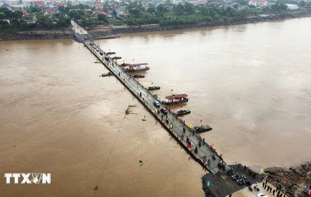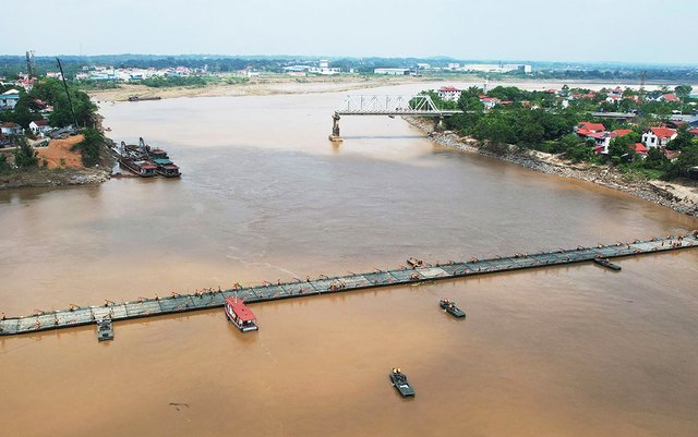 Sau khi lắp đặt xong, từ 6h ngày 30/9, người, xe thô sơ, xe mô tô, xe gắn máy, xe ô tô con và xe bán tải lưu được đi qua cầu phao Phong Châu (Phú Thọ).