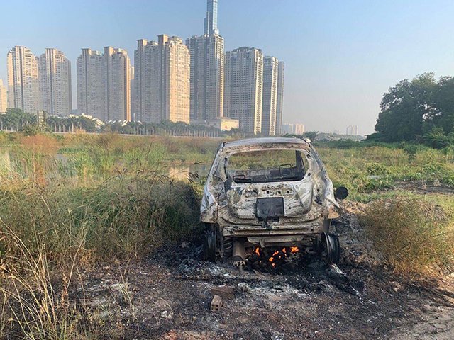 Đang điều tra tại hiện trường người phụ nữ Hàn Quốc tử vong, hai người khác bị thương ở quận 7, TP HCM, cảnh sát nhận tin chiếc ôtô liên quan đã bị đốt.