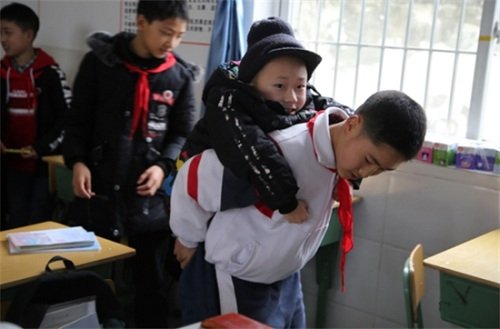 Xu Bingyang đưa bạn đến trường, di chuyển giữa các lớp học, cõng lên cầu thang hàng ngày mà chưa một lần kêu mệt.