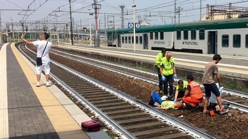 Một nam thanh niên chụp selfie, sau lưng là đội cứu hộ đang cấp cứu một phụ nữ bị tàu hỏa đâm, đã khiến dư luận Italy phẫn nộ.