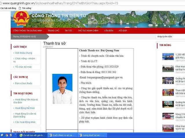Chánh Thanh tra sở Văn hoá – Thể thao (VH-TT) Quảng Ninh phụ trách mảng giải quyết khiếu nại, tố cáo và phòng chống tham nhũng bị phản ánh cùng tổ công tác nhận phong bì để “bỏ qua lỗi” trong một đợt thanh tra vào cuối năm 2017.