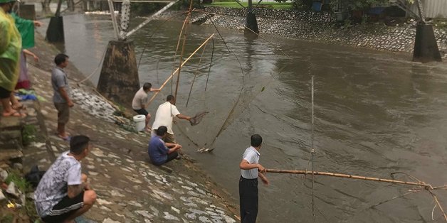 Sau trận mưa như trút nước vào ngày 3/8, người dân Hà Nội hồ hởi rủ nhau mang vó, cần câu ra sông Kim Ngưu đánh bắt cá.