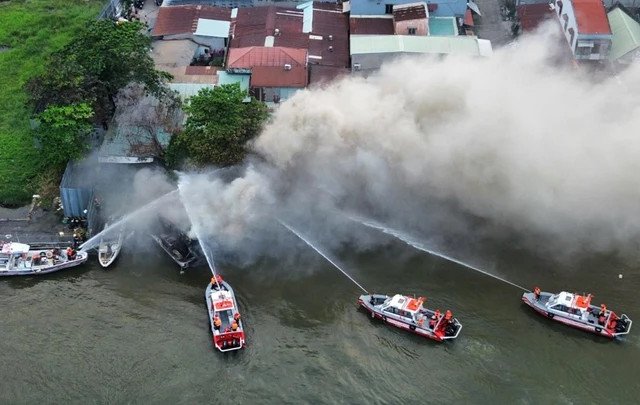 Du thuyền đang neo đậu bên bờ sông Sài Gòn bốc cháy dữ dội, lực lượng chức năng ngay sau đó đã có mặt để dập lửa.