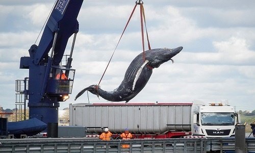 Con cá voi lưng gù cái chưa trưởng thành dài ít nhất 10 mét có thể bị tàu đâm trúng trước hoặc sau lúc chết.