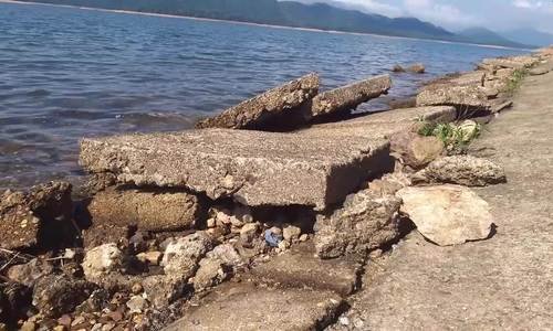 Nhiều tấm lát bê tông của hồ Kẻ Gỗ (Hà Tĩnh) bị đứt gãy, bong rời, đe dọa kết cấu của thân đập với chiều dài khoảng 700 m.