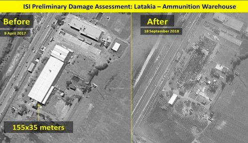 Cơ quan ImageSat của Israel ngày 19/9 đã công bố hình ảnh chiến đấu cơ nước này phá hủy kho vũ khí của Syria, trong đó có nhiều tên lửa phòng không.