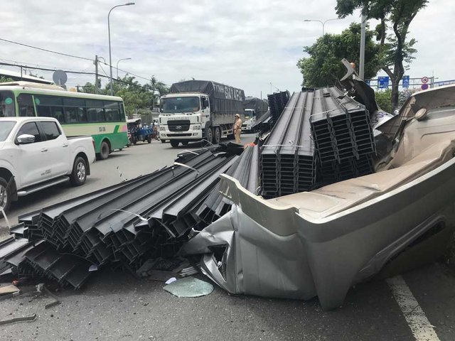 Tài xế phanh gấp làm hàng trăm thanh đà bằng thép trượt tới ủi bay cabin cùng tài xế khỏi xe container trên quốc lộ 1 ở Sài Gòn.