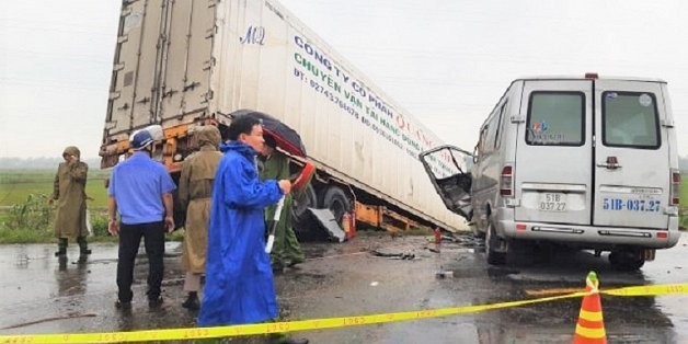 Chiếc container kéo theo rơ moóc chạy hướng Bắc-Nam trên Quốc lộ 1, đến địa phận Quảng Ngãi thì tông trực diện xe khách khiến 2 người chết, 11 người bị thương.