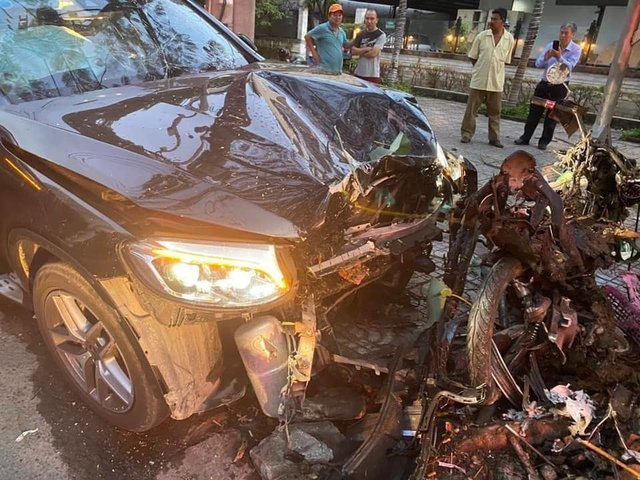 Xe Mercedes do tài xế nghi say xỉn điều khiển tông trúng xe máy khiến tài xế GrabBike tử nạn, khách hàng là 1 nữ tiếp viên bị thương rất nặng.