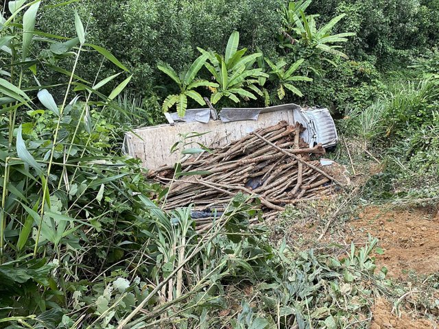 Chiếc xe tải chở cây trồng tại các công trình khi lưu thông trên QL14E thì bị mất phanh, lao xuống vực. Rất may tài xế và phụ xe kịp thời thoát ra ngoài.