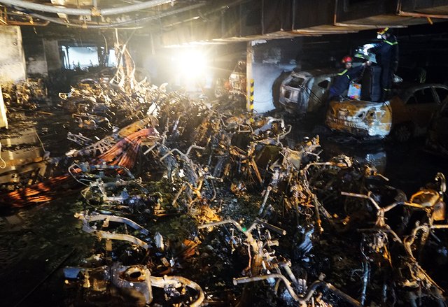 Hàng trăm xe cháy rụi trong hầm chung cư 13 người chết ở Sài Gòn