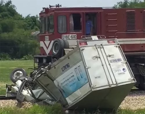Xe tải bị tàu hàng tông nát bét khi băng qua đường sắt