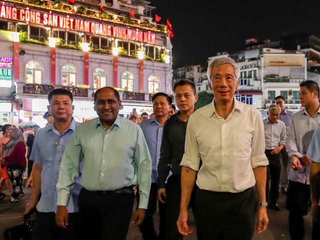 Tối 27/8, tại Thủ đô Hà Nội, Thủ tướng Cộng hoà Singapore Lý Hiển Long đã vãn cảnh tại phố đi bộ quanh hồ Hoàn Kiếm và thăm đền Ngọc Sơn.