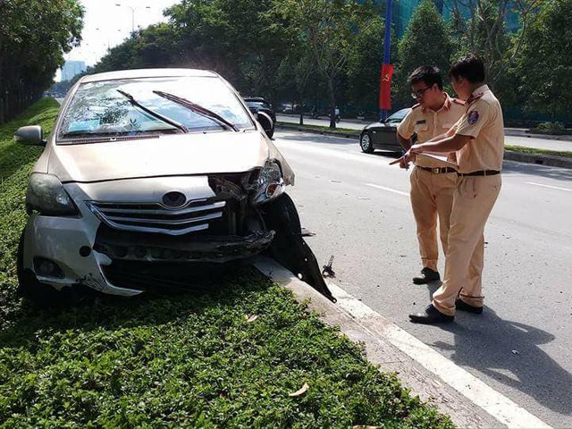 Cú va chạm mạnh giữa xe cứu hỏa và xe taxi khiến 4 người ngồi trên xe bị hất bay lên lề đường.