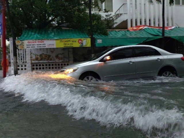 Mưa như trút khiến phố thành sông, người Đà Nẵng bì bõm đẩy xe giữa biển nước