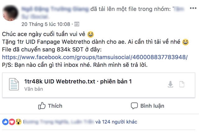 Tập tin đang được phát tán bị cho của 800.000 thành viên fanpage Webtretho, gồm số điện thoại và ID tài khoản Facebook. Trước đó, Shopee và Pond cũng từng là nạn nhân.