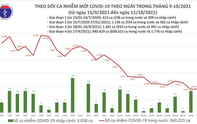 Chiều 11/10, Bộ Y tế công bố thêm 3.619 ca COVID-19, trong đó 3.617 ca ghi nhận trong nước.